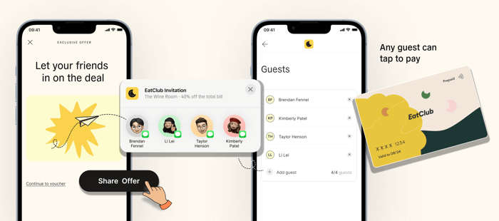When you share with existing EatClub members, it activates everyone’s EatClub Pay Digital Card so anyone can pay, or do rounds at a bar. If they’re new to EatClub, they can easily sign up and activate their own EatClub Pay Digital Card to pay for their meal.